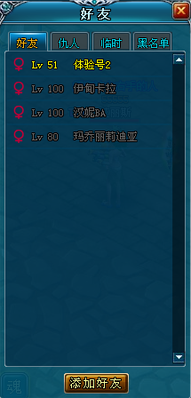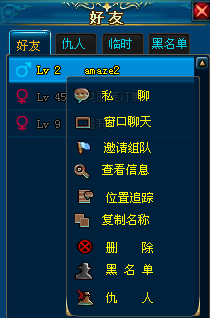 “好友”窗口里有“好友”、“仇人”、“临时”和“黑名单”