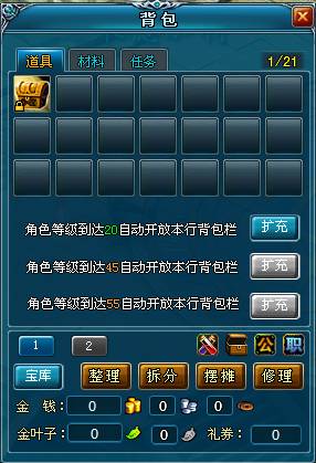3)玩家级别达到55级,自动扩充1行道具背包格。