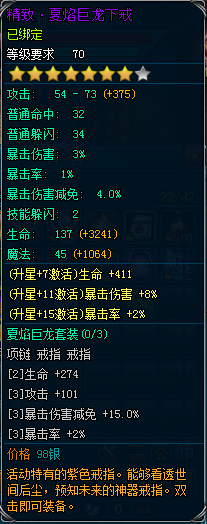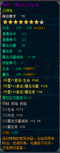 夏焰巨龙为三件套紫色首饰系列,同时穿戴三件并均升星到一定的星数,能够激发起强大的套装属性,整体属性激发后接近甚至部分超越了全套88级其他紫色首饰的属性,充分发挥了低级可穿戴的优势!
