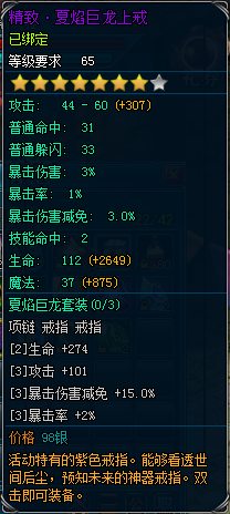 穿戴:一件夏焰巨龙坠饰(78级)15星,一件夏焰巨龙上戒(65级)15星,一件夏焰巨龙下戒(70级)15星