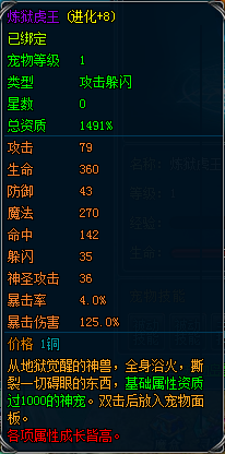 炼狱虎王为当前原始基础属性最高紫色宠物,无论是外形,成长,均可藐视一切!!!