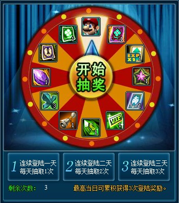 2.周年庆幸运转盘玩法规则与原来登陆奖励转盘规则一样,每日连续登陆,赢取更多抽奖机会;