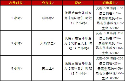 1.活动期间,玩家每天在游戏里累计在线时长达到1小时、3小时和5小时,即可到米德加特城【在线兑换NPC——丝奇】处领取相应的怪物变身装1个;