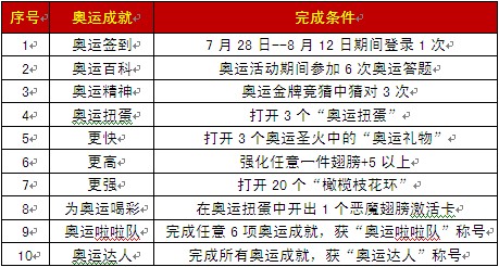 1.活动期间,成就系统→【庆典】里将新增一页【奥运盛典】成就,完成对应的成就,可获得尊贵的奥运系列称号。