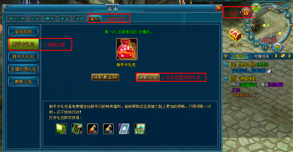 2.在游戏中点击小地图旁边的【活】字按钮进入活动面版,再选择【福利】→【新手卡礼包】,通过领取到的激活码兑换新手礼包;