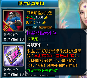 | 开服第1-2天 | 风暴熊猫大礼包 | 1880 | 888 |