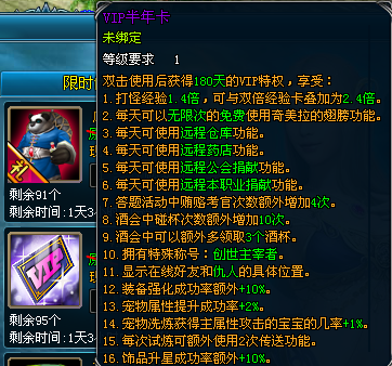 VIP半年卡:高额经验收益,更高的强化成功率,方便快捷的远程仓库、捐献、商店,无限传送,特殊尊贵称号:创世主宰者,还有千里眼追踪仇人特权,一共16项强大无比的特权;