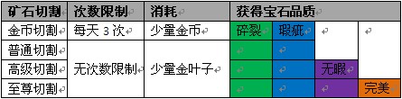 切割类型不同,每天可切割次数、消耗以及获得宝石品质都是不同的。