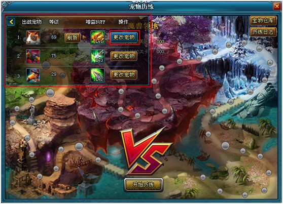 点击【历练】面板左侧的【选择宠物】按钮,可打开选择宠物界面。