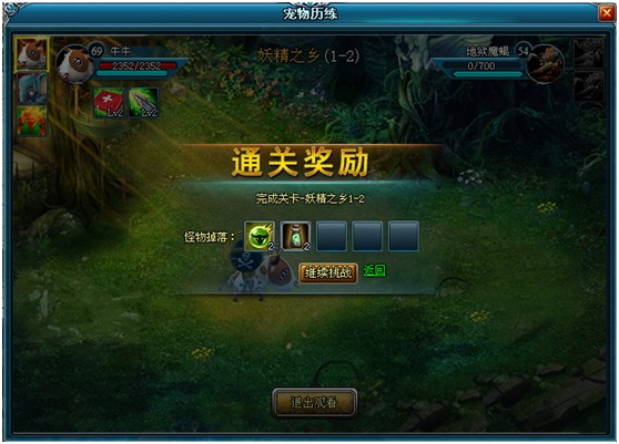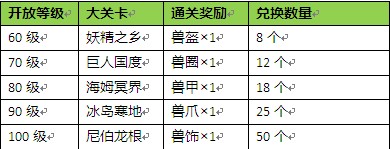 每通过一个小关奖励宠物经验药、魔兽精魂、驯兽师之证,数量随机,每个通过一次大关奖励人物小型经验药,数量和人物等级和宠物自带的技能BUFF有关