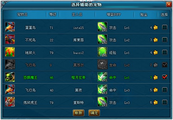每天系统将随机刷新辅助宠物的增益BUFF种类和等级。