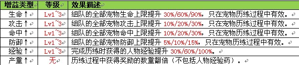 增益BUFF只在历练过程中有效,提升该队所有宠物的属性。