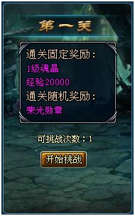 玩家将鼠标移到解锁成功的关卡上,可看到关卡的奖励、可挑战次数、开始挑战按钮。
