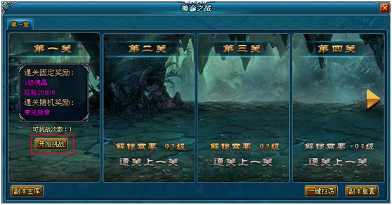 玩家在神谕之战中,挑战每个章节的各个关卡,可获得不同等级的“魂晶”和人物经验奖励,以及荣誉勋章的随机奖励。