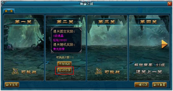 已经通关过1次的副本关卡可使用【自动扫荡】功能(只有已经通关过1次的关卡才出现)。