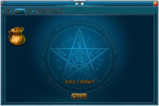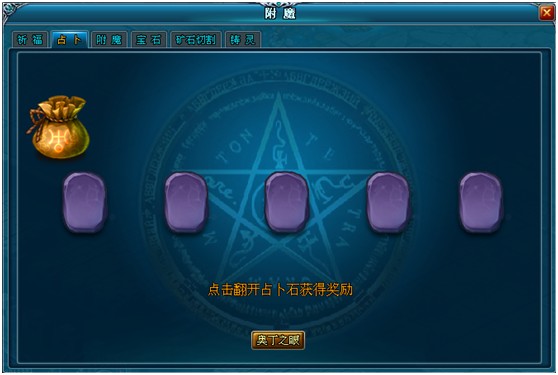等级达到60级的玩家就可通过点击系统图标【附魔】→【占卜】来打开占卜系统界面。