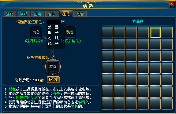 5)秘炼之后参加秘炼的两件装备消失(如果装备上有符文,则符文也消失)