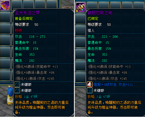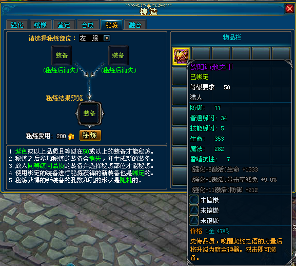 2)同等级(50级或以上)的装备才可以秘炼。