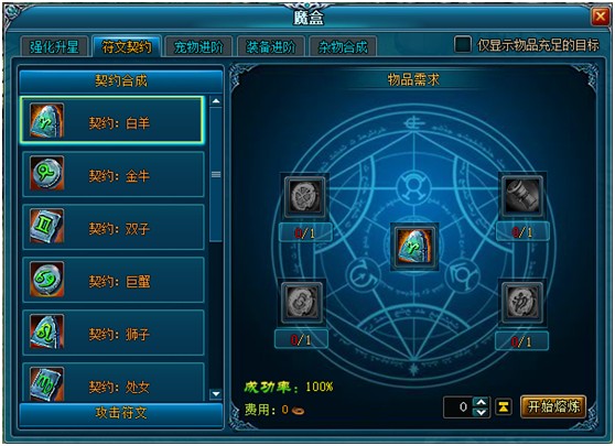 契约可以通过【魔盒】→【符文契约】中的契约合成,使用契约合成公式规定物品熔炼获得。契约一共分为十二种,分别为:白羊、金牛、双子、巨蟹、狮子、处女、天枰、天蝎、射手、摩羯、水瓶、双鱼。