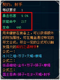 契约是一种篆刻了神秘星座形状的小石头,可以将其镶嵌在对应的孔槽中;契约像符文一样,可以为任意有镶孔的装备使用,从而获得额外的附加属性。