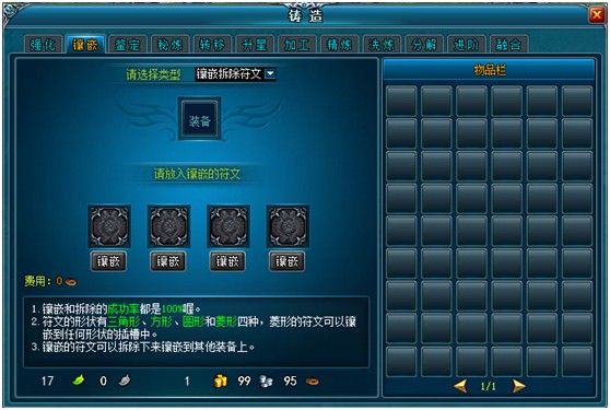 契约的镶嵌和符文一样,可以在【铸造】→【镶嵌】中的【镶嵌拆除符文】进行操作。注意,一件装备上,不能同时镶嵌两个一样的契约。