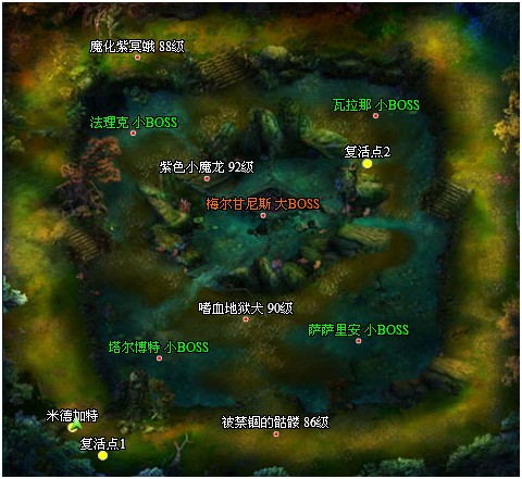勇士们冲破广场外围怪物的封锁,进入禁魔广场后,在广场4个角落的浅水沼泽中各藏匿着一个小boss(冥界统领),这些小boss将在上午10:30和晚上19:00各自随机线路出现,小boss出现后,每隔一段时间将分别释放“海妖之歌”、“魔魅”、“灵魂冲击”、“灵魂侵蚀”技能,将分别使一定范围内的敌人进入短暂的“昏睡”、“魅惑”、“眩晕”、“虚弱”状态。