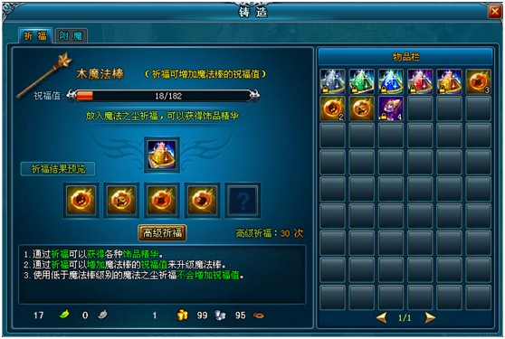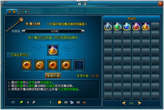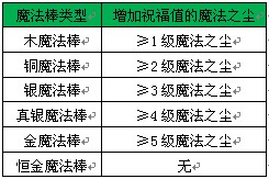 玩家可以通过【祈福】增加魔法棒的祝福值,魔法棒共分为木魔法棒、铜魔法棒、银魔法棒、真银魔法棒、金魔法棒、恒金魔法棒。木魔法棒祝福槽满了将自动升级成铜魔法棒,以此类推;当魔法棒等级到达恒金后,祈福将不再增加祝福值。若祈福中使用的魔法之尘等级低于魔法棒等级,将不会增加祝福值。当祈福时,使用的魔法之尘等级高于魔法棒等级时,魔法棒所增加的祝福值与魔法棒自身等级有关,和魔法之尘级别无关。